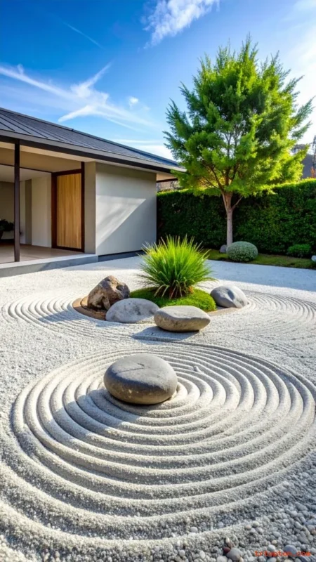 Rake the gravel in simple lines for a calm pattern. Add a sculptural plant like a dwarf pine or Japanese maple for focus.