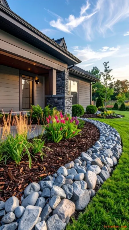 Rocks give a bed a finished edge and help control mulch drift. They also fit well with both modern and rustic styles.