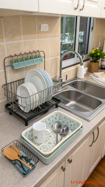 A dish rack can look stylish instead of messy. Choose wood or matte metal for a clean look. Keep it small and place it on a tray to catch water neatly.
