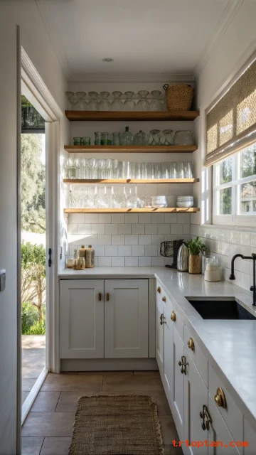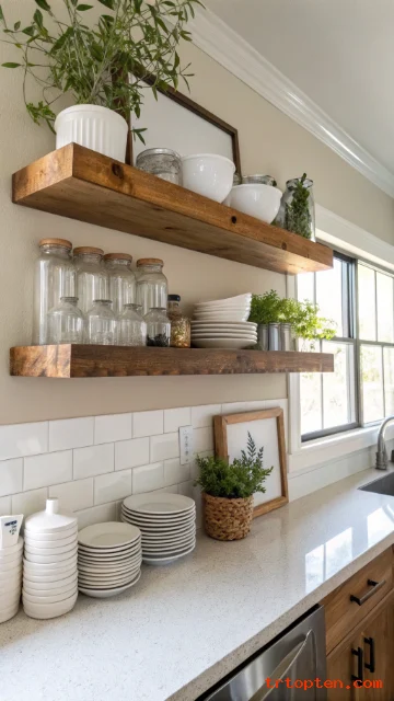 Floating shelves open up the wall and make the kitchen feel wider. Place matching jars and a few dishes on display to keep it neat. Leave some empty space on the shelves so the wall can breathe.