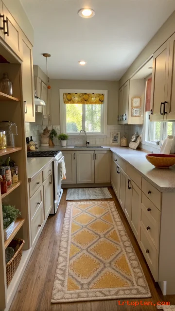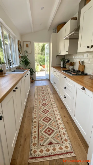 A runner adds color and comfort without crowding the floor. Choose a washable rug because kitchens get messy. Pick a low-contrast pattern to keep the room feeling open.