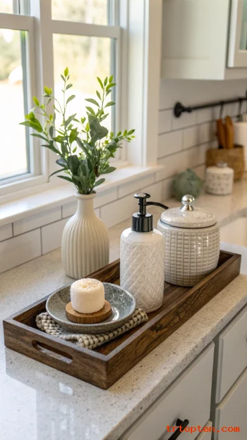 A tray creates a clear home for daily items, so the counter looks less cluttered. Place soap, a small vase, and a salt cellar inside the tray. Keep the rest of the counter open for prep work.