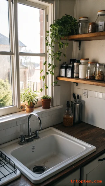 That space above the sink often goes unused, but a slim shelf fits well there. Use it for a small plant, a candle, or two pretty jars. Keep items short so they do not block light.