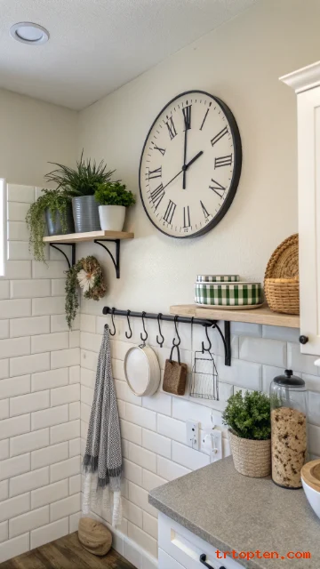 A clock adds function and a finished look without taking up counter space. Pick a simple face so it reads fast. Match the clock frame to your hardware for an easy tie-in.