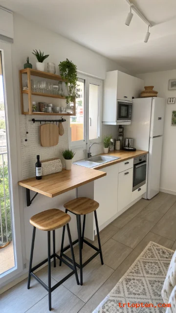 A fold-down table gives you a small dining or prep spot without taking floor space. Keep the wall around it clean for a sleek look. Style it with one small item when folded up.