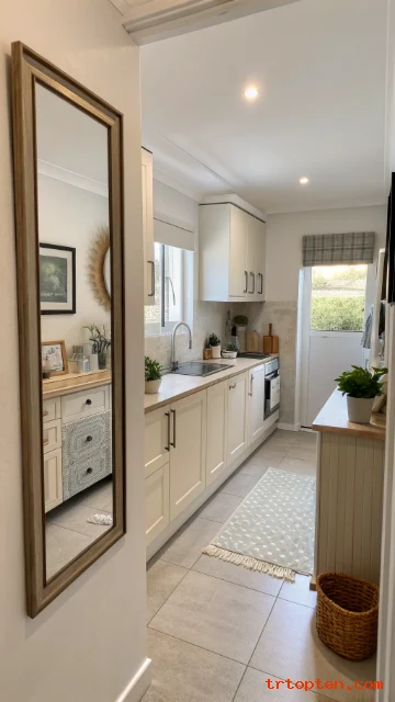 A mirror makes a small kitchen look bigger by bouncing light around. Place it on a narrow wall or above a small breakfast nook. Keep the frame slim so it feels light, not heavy.