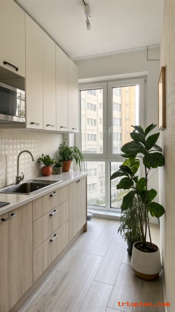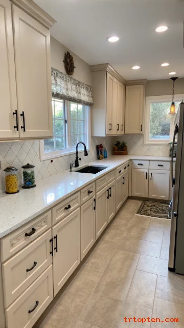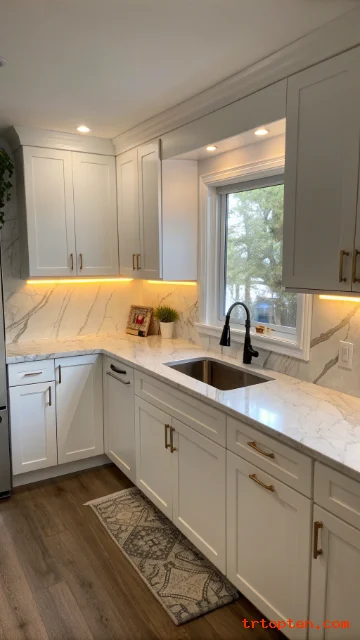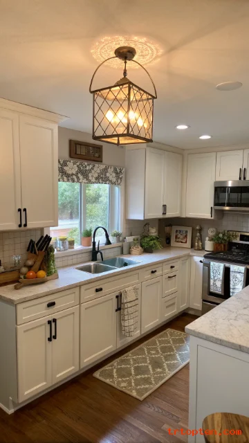 Use layered lighting like ceiling light plus under-cabinet lights. Warm white tones can make the room feel inviting.