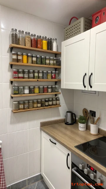 A wall spice shelf looks organized and saves drawer space. Use matching jars or labels for a clean line. Keep the shelf close to the stove for quick cooking.