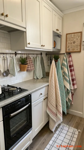 Matching towels make the kitchen feel pulled together. Pick two or three colors that match your room and repeat them. Hang towels neatly on hooks or an oven handle.