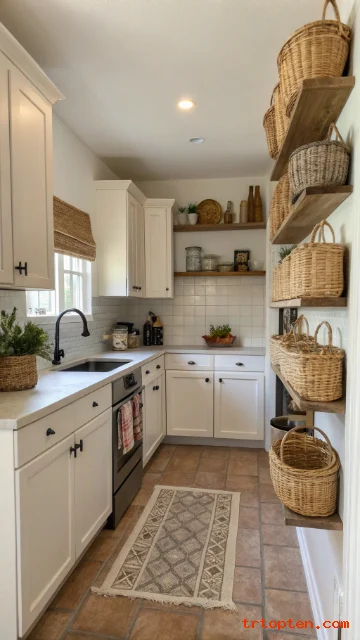 Baskets add texture and hide items you do not want on display. Use baskets that match in color and weave. Keep the basket count low so the top line looks tidy.