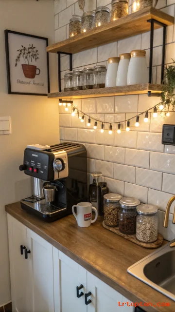 A coffee corner feels special, even in a small kitchen. Use a small shelf or wall hooks for mugs to save counter space. Keep the setup tight with only what you use daily.
