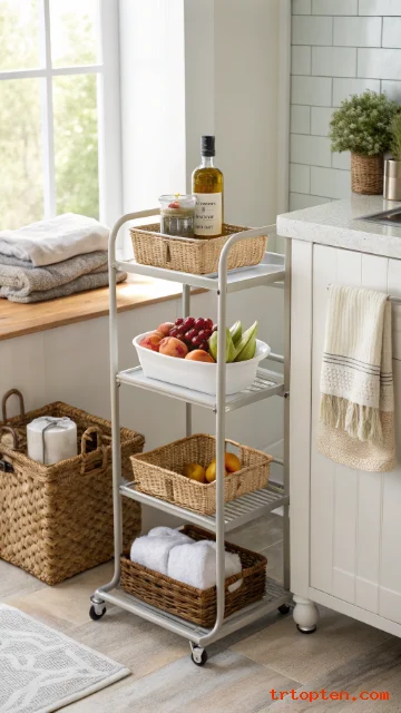 A rolling cart fits into small gaps and gives you a flexible prep spot. Style the top with a tray, a bowl of fruit, and one pretty bottle. Keep the lower shelves for towels or pantry items.
