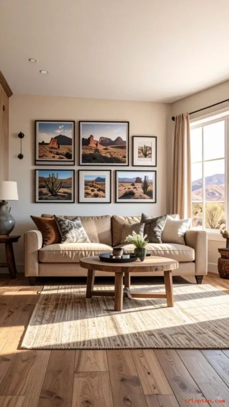 Create a western gallery wall using black frames for a clean look. Mix cowboy photography, desert landscapes, and simple line art.
