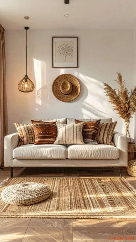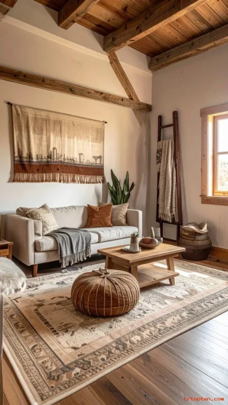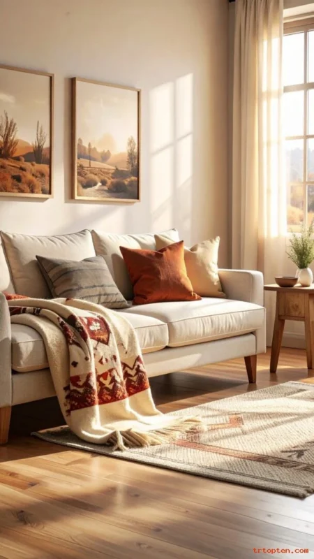 Use a Navajo-inspired blanket to add pattern without changing big furniture. Place it neatly over one sofa arm or across the back.