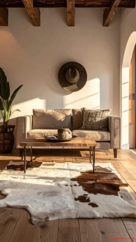 Use a cowhide rug to create a western focal point without adding visual clutter. Keep the rest of the floor simple so the rug stands out.