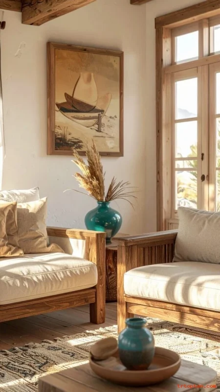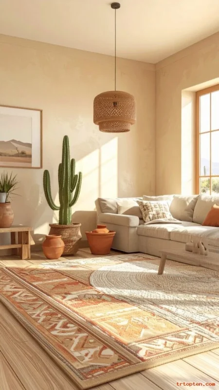 Use sand, clay, and warm cream tones to mimic desert scenery. Add terracotta through pottery, pillows, or a small accent stool.