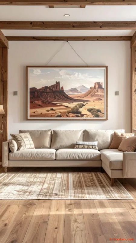 Pick a desert scene, horse sketch, or cowboy silhouette in muted tones. Use a simple frame to keep it clean.Center it above the sofa and leave space around it. This creates calm and stops wall clutter.