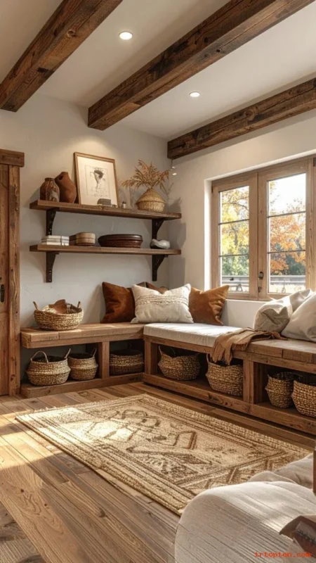 Use benches with hidden storage, trunks, and baskets under shelves. Wall shelves also add storage without eating floor space.
