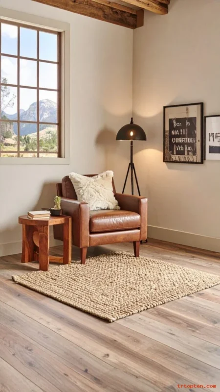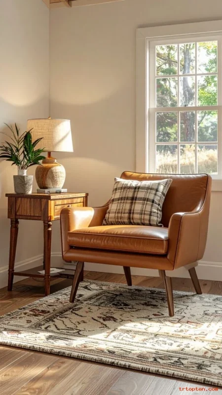Choose a chair in camel, saddle brown, or deep tan for a classic ranch feel. Add a small table lamp with a linen shade to soften the edges.