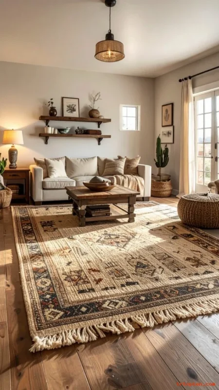 Pick a top rug with a faded kilim or simple geometric print. Keep the colors dusty and soft so the room feels open.