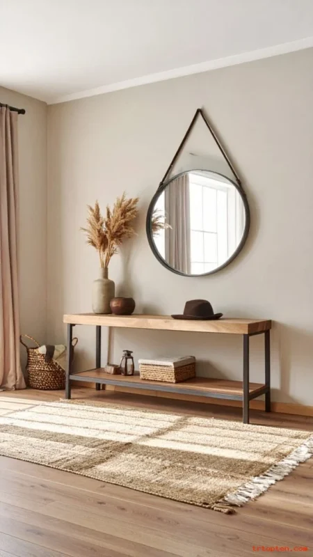 Hang it across from a window to bounce daylight. Keep the mirror size medium so it fits the wall.Pair it with a slim console table under it. Use one small bowl or tray for keys and remotes.