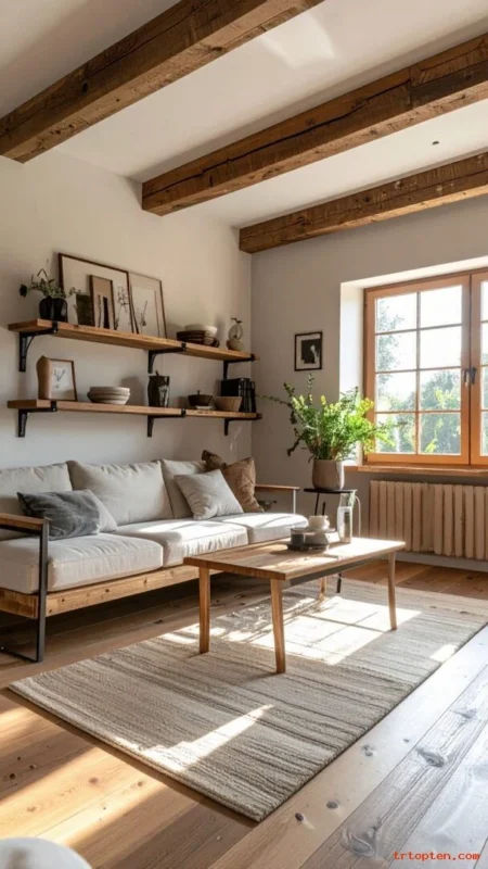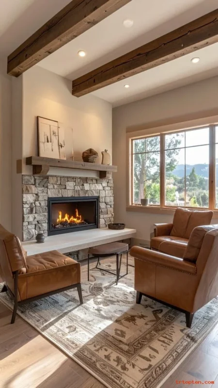 If you have a fireplace, keep the mantel styling minimal. Use one long wood beam shelf or a slim reclaimed plank.