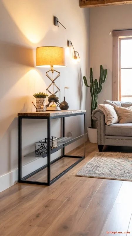 Pick rustic wood with black metal legs for western style. Keep it narrow so walk space stays open.Add a small lamp and one framed photo. Store coasters in a tiny bowl to keep the top neat.