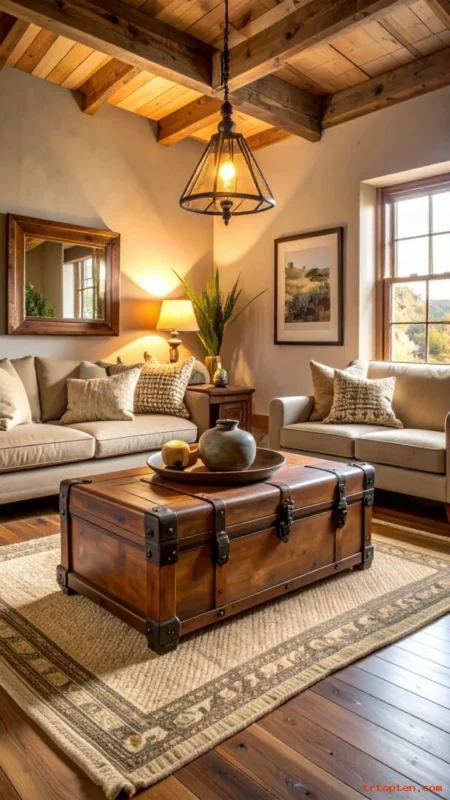 Choose a trunk that fits your seating width. Keep it low so it feels comfortable for drinks and snacks.Store extra pillows, games, or seasonal throws inside. Add a small tray on top for a stable surface.