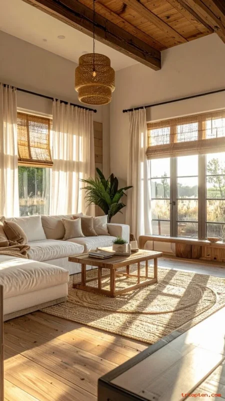 Choose linen curtains or woven shades to keep sunlight moving. Heavy drapes can make a small room feel tight.