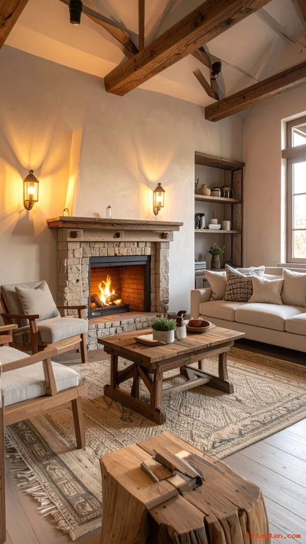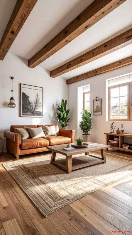 Match the beams with one other wood element like a mantle or shelf. This repeat creates harmony and keeps the space calm.