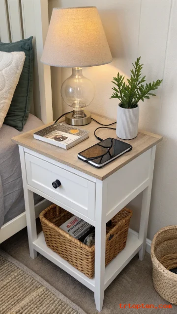 Keep only a lamp, a book, and a small tray. Use a small plant or a glass of water as a simple touch. Hide cords and chargers in a drawer or basket. Wipe the surface daily to keep it clean.