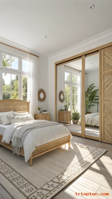 A mirror can make a bedroom feel bigger and brighter. It reflects sunlight and adds a clean focal point.