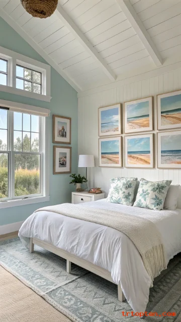 Choose beach photography, abstract pastels, or simple line art. Use light wood or white frames. Hang art at eye level for a clean look. Keep the wall layout simple to reduce visual noise.