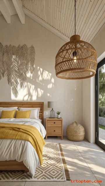 A woven pendant light creates soft shadows and warm texture. It fits coastal and boho summer styles well.