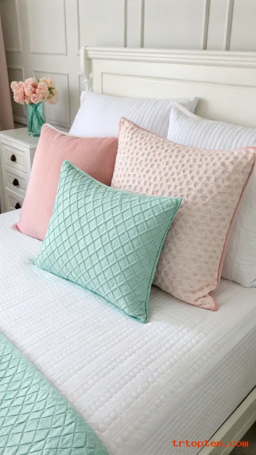 Choose two pastel shades like blush and mint or sky blue and lavender. Mix one solid pillow with one textured pillow. Keep pillow count simple so the bed looks clean. Fluff daily to keep shape.