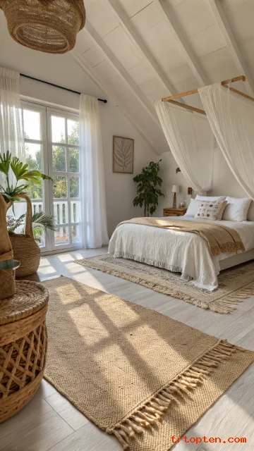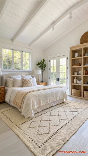Place a jute rug under the bed so it frames the space. Add a smaller cotton rug on top for softness. Keep the top rug light and simple. This prevents the floor from feeling busy.