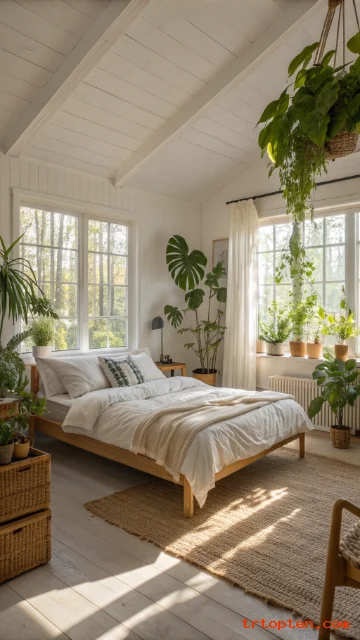 Place one tall plant in a corner and one small plant on a nightstand. Use simple pots in white or terracotta. Water on a set schedule so plants stay healthy. Wipe leaves to keep them glossy and dust-free.
