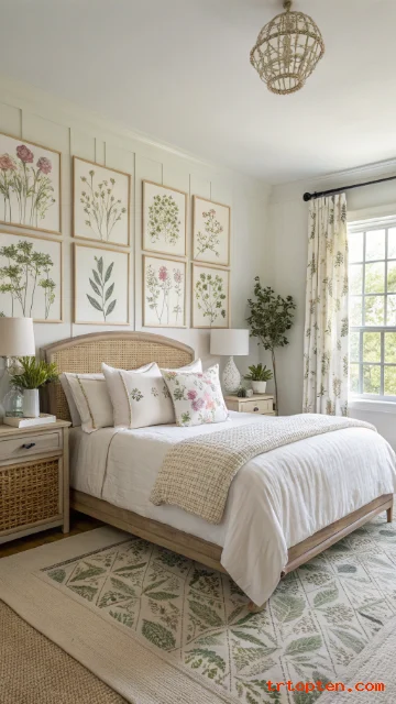 Use a floral pillowcase, a small quilt, or a framed botanical print. Choose prints with lots of white space. Keep floral colors muted for a calm mood. Pair with solid bedding to avoid pattern overload.