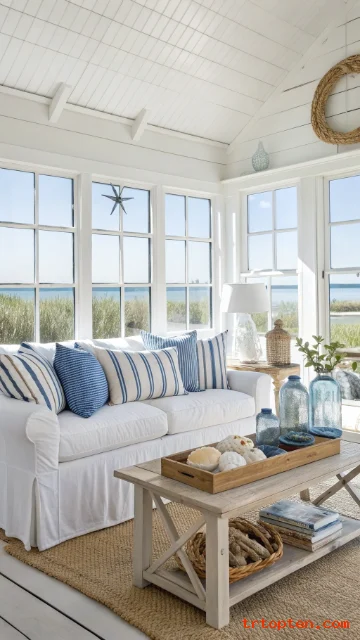 Decorate with driftwood, glass jars, and seashells in small doses on shelves or tables. This keeps the space breezy and beachy without feeling like a theme park.