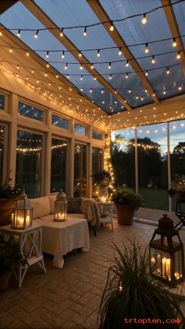 Soft lighting can transform your sunroom at night. String lights create a warm and magical feeling that works for relaxing or hosting friends.