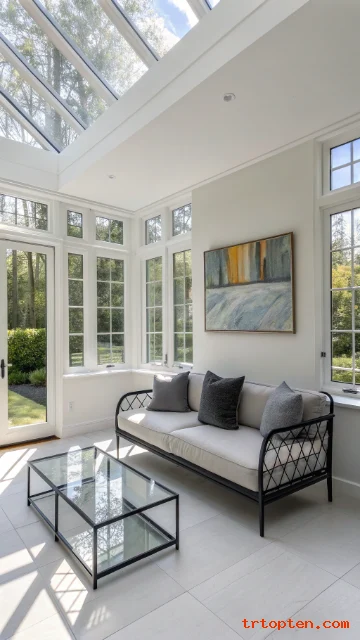 A minimal modern sunroom keeps lines clean and clutter low. Use a small number of well chosen pieces instead of filling every corner.