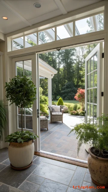 Keep doors clear and simple so they open fully without hitting furniture. Add planters that repeat from outside to inside to complete the flow.