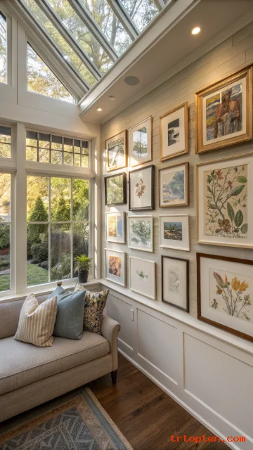 Keep enough space between frames so the wall does not feel crowded. Add art that reflects nature, travel, or family memories to tie the sunroom to your life.