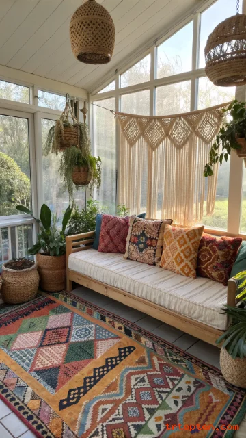 Boho sunroom decorating ideas focus on layers, pattern, and relaxed charm. Start with a simple sofa or daybed and then build interest through textiles.