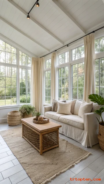 Layer in subtle texture through woven baskets, jute rugs, and knitted throws. This adds interest without breaking the calm mood of your neutral sunroom decor.