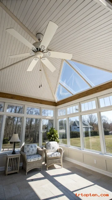 Use the fan’s reverse setting in cooler months to push warm air down. This makes the sunroom more usable across seasons.