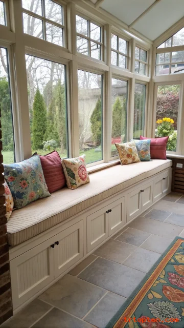 Built in benches make smart use of wall space in a sunroom. They also add plenty of hidden storage for blankets, pillows, and games.