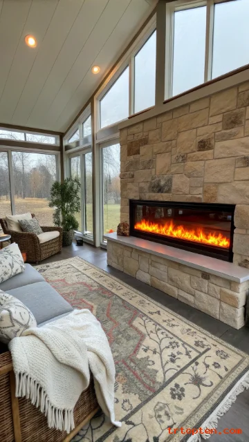 An electric fireplace or stylish heater extends sunroom use through cold months. It adds visual warmth along with actual heat.