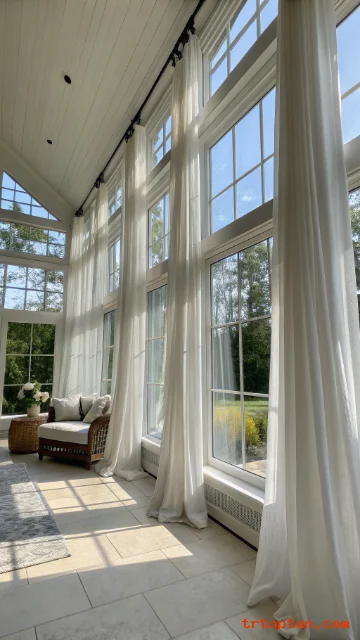 Choose sheer curtains in white or cream to filter light while keeping the view. Hang them high and wide to make windows look larger.