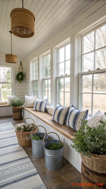Farmhouse sunroom decorating ideas add warmth with wood, metal, and soft fabrics. Use a mix of painted and natural wood furniture for a lived in feel.